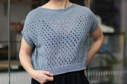 Kevyt is a simple casual summer tee knit, designed for a yarn made from recycled jeans. It features an easy eyelet stitch pattern and a drop shoulder line made with increases.