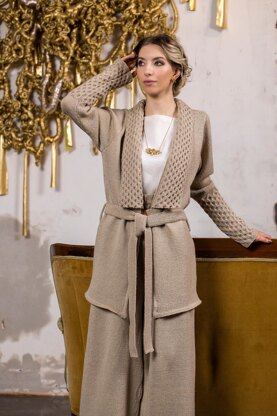 Named after the philosopher, poet and mathematician Omar Khayyam who worked on problems of Algebra is this long slightly oversized jacket with a cable collar and long cuffs. The remaining parts are knitted in stockinette stitch to make the cable stand out. A double belt in stockinette stitch highlights the beginning of the collar. Khayam is worked in pieces for the ultimate fit and made to be worn with the Laplace trousers as a set. Both are knitted in the Bendigo Classic 5 ply with a crepe construction.