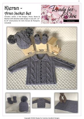 Pattern includes Jacket, 2 Hat Designs, Boots, Shoes and Blanket with instructions to knit buttonholes on both sides. 26" chest can be made using 5mm needles and has a finished chest size of 29". Includes details on knitting fur pom-poms. Uses a combination of 3 different cable designs with moss stitch and reverse stocking stitch. Blanket is suitable for a standard pram/carrycot/pushchair