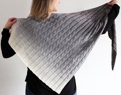 A beautiful alternating cable-rib motif creates this eye-catching, cosy triangular shawl.