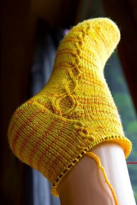 [notes] • The socks are worked toe-up on (1 or 2) circular needle(s), starting with Judy’s Magic Cast On. (http://knitty.com/ISSUEspring06/FEATmagiccaston.html) Use dpn’s if you like. • The toe is in stockinette stitch, the side of the foot, the gussets, and leg are patterned. • The socks feature ‘gusset and flap’ heels: gusset increases are worked on upper foot, the heel is turned with short rows, then the gusset stitches are decreased away as the heel flap is worked. • Short-row turns for heel turn are concealed by wrapping a stitch at each turn. On transition row, work each wrap with the stitch it wraps, as follows: To knit a stitch with its wrap on the left side of the heel turn, insert right needle under front of wrap and into knit stitch, and knit together. To knit a stitch with its wrap on the right side of the heel turn, insert right needle under front of wrap and into knit stitch,