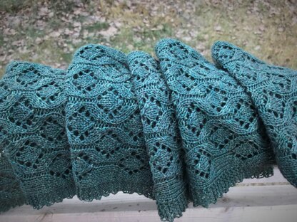In order to achieve symmetry in the lace patterns, this scarf is worked in two pieces from the ends toward the centre. The two pieces are then grafted together using kitchener stitch.