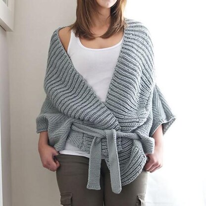 **Kimono style wrap cardigan in a herringbone slip stitch with a generous ribbed shawl collar and tie belt. **