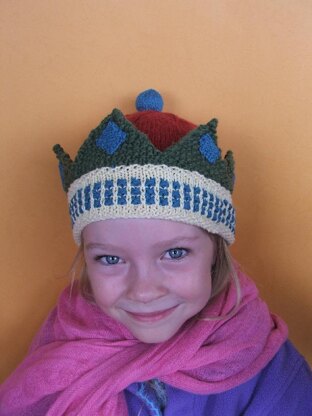 Here is a wonderful crown pattern for any little kings or princes (or queens or princesses for that matter). It is knitted-in-the-round. It's quite quick to knit up, although the optional jewels require some hand sewing to attach them. You will need to pick up and knit stitches. Gauge is 22 sts to 10cm or 5 1/2 sts to 1 inch over stocking stitch (stockingnette). Written instructions are very detailed and include explanatory photos where necessary. Included with the pattern is an introduction to circular knitting as well as techniques and abbreviations. The band uses 2 yarns: 1 for the main colour and another for the dots. The "dot" yarn is also used for the ball and jewels. The 3rd yarn makes the crown spikes and the 4th, is the crown or top of the beanie. Yardage for larger size is approximately 230m/250yards and 215m/235yards for small size.