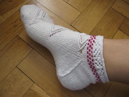 One of four anklets designed in honor of the Tour de France, road cycling's premiere event. This pattern commemorates the Climber's Jersey, also known as the King of the Mountains. With hairpin turns, mountain peaks and the red polka dots worn by the fastest climber in the tour, these socks have a bit of everything. Worked from the toe up, in sizes from XS (women’s 5-6) to XL (women’s 11+, men’s 10), these anklet socks use 2 balls of Cascade Fixation and a small remnant of any red/pink fingering weight yarn for the polka dots. Stitch patterns are presented in written and charted forms.