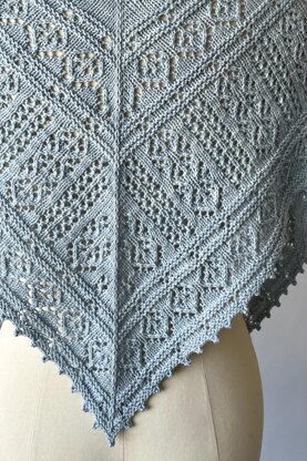 CONSTRUCTION: Knit from the top down with increases every right side row to create the triangular shape. Two garter stitches are worked for the border and one stockinette stitch is worked for the center spine. The bottom edge is finished with a picot bind off.