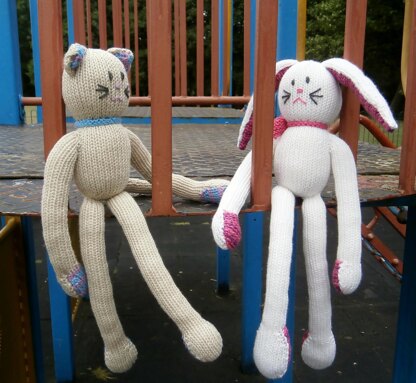 Two long legged toys, sized to make them easy for babies to hug and hold. The yarn used is a lovely, soft, stretchable cotton mix.