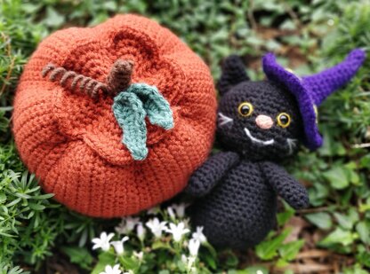 Kit Cat has a total length of about 18 cm and the pumpkin about 17 cm height and 20 cm width, using Aran weight yarn. The cat fits perfectly inside the pumpkin. You can also use the pumpkin to store some candy for example. Perfect for Halloween :D The pattern is written in English (US) using US terminology.