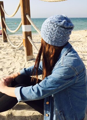 This slouchy hat is knit in the round. It starts with a two by two ribbing in the brim and a chevron lace pattern. Crown is knit in seed stitch. It can be modified to only 7 patterns repeats instead of the written 8, to have a less slouchy version. Any fingering weight yarn will work to knit the hat. I wanted to create a hat to be worn on cooler days to go with my jeans jacket.