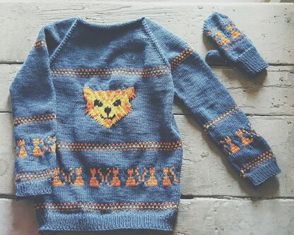 A child’s jumper in lovely soft and squishy Millamia naturally soft merino. In 2 sizes: ages 4-6 and 6-8 With intarsia cat’s face, and cat motifs. (Note - Can be knitted without the cat’s face if intarsia in the round makes you nervous – maybe replace it with another row of cats?)