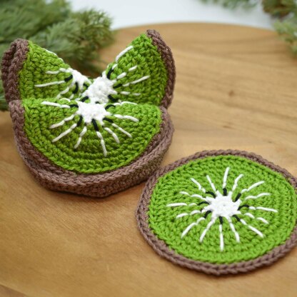 This crochet pattern includes steps to create four coasters and one simple bowl. Steps to embroider the kiwi coaster details are also included.