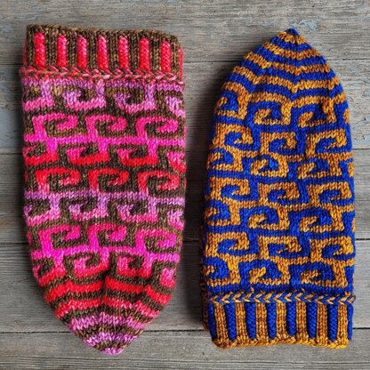 This slouchy hat uses 4 different color work techniques, all explained in the pattern - two color stranded ribbing and 2 color knitted braid used in the brim, simple stripes on the crown, and mosaic color work for the main hat body - a surprisingly easy technique where only one color is worked at a time.
