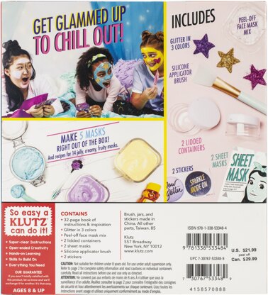 Get glammed up so you can chill out! Treat yourself to a selfie-worthy face mask, customized with fresh ingredients and lots of glitter! Use the peel-off gooey mask mix and sheet masks to make five treatments. This 8x9 inch package contains 32 page book of instructions and inspiration, glitter in three colors, peel-off face mask mix, two containers with lids, two sheet makes, and one silicone applicator brush. Recommended ages eight years and up. WARNING: Choking Hazard. Not suitable for children under 3 years. Made in USA.
