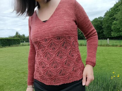 Yarn : This sweater is knit with a yarn of type fingering weight (Here merino from C’Laines 400m /100g). Approx. : 980, 1085 (1200, 1315, 1430) 1545, 1660, 1770 m 1070, 1190 (1315, 1440, 1565) 1690, 1815, 1935 yards.