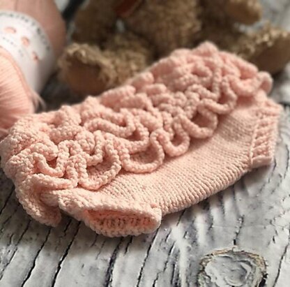 These knickers were designed for my granddaughter; they are a fun knit that will look super cute on babies of all ages. The bottom has ruffles which are added at the end, but can be left off for a plainer knit if preferred.