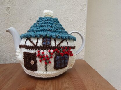 These cosies were inspired by the quaint cottages of Suffolk, a place very dear to me. There are two styles: One with plain walls and the other with beams, both decorated with roses around the door and windows.