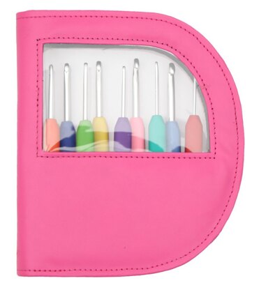 Set of smooth aluminium crochet hooks with colourful soft grip handles, unique to size, stored in a fluorescent pink carry case. Faux leather material, with a clear vinyl window and zip fastening. Contains sizes: 2,2.5,3,3.5,4,4.5,5, 5.5 & 6mm.