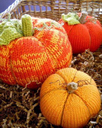 A knit pumpkin design, no felting required, three different sizes are created using diiferent weight yarns. See below for materials guide on each size.
