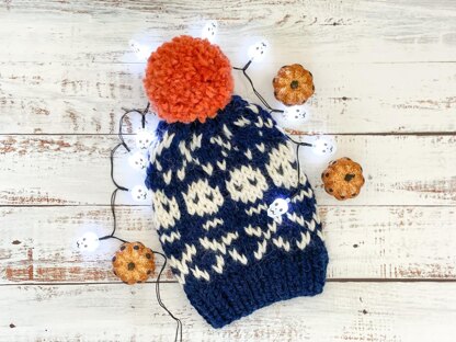 The Halloween Skull Slouch Beanie is knitted using super bulky yarn from the bottom up.
