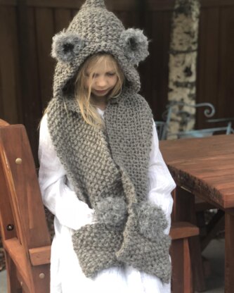 This adorable hooded scarf features a warm, chunky design with playful crocheted ears and fluffy pom poms. Knitted using simple knit and purl stitches (moss stitch), it’s a beginner-friendly project perfect for anyone looking to create a charming and cozy accessory.