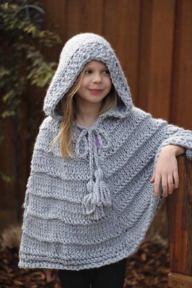 This beautiful, modern hooded poncho is easy and quick to create, fitting childrens' sizes 6-10. It is simple knit and purl and is made from 5 knitted parts that are simply sewn together. There is an optional crocheted edge for a more unique look.
