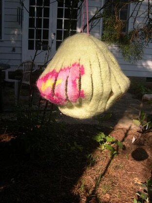 Looking for something to make an ordinary evening enchanting? This super-easy garden lantern is knit completely in the round. Color designs are added before felting using Swiss darning (duplicate stitch) ... so don't worry about following a color chart or having to carry yarn! After knitting, felt the lantern in your washing machine. Making simple slits all the way around after felting allow the light from a battery-operated candle to shine through. This is so simple, you'll want to make several to hang in your garden! The pattern directions include instructions for Swiss darning, too!