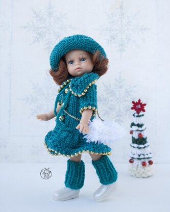 This PDF pattern for knitted outfit includes a description of knitting dress, hat, gaiters and fur hand muff.