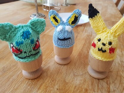A knitting pattern to create 3 different egg cosies, each inspired by a different Pokemon character (Bulbasaur, Pikachu, Froakie).
