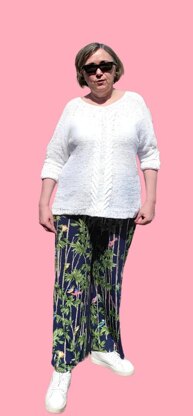 Knitting instructions for a white jumper with cable and twist patterns. Size XXXL.