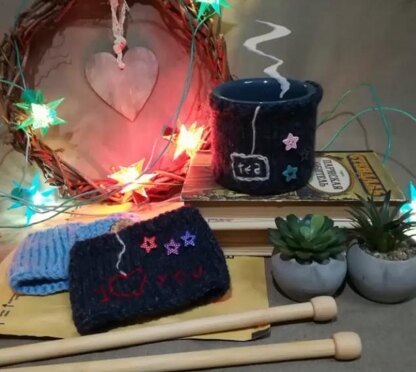 I suggest knitting warm shirt for your favorite mug! The tea will not cool down so quickly, it will not burn your hands and will be very comfortable! Knit according to the suggested pattern and decorate as you like! Create a cozy gift or kitchen decor item. You will need wool or wool blend yarn 25-30 g. (240 gr. / 100 mt.) Knitting needles No. 4, wide eye needle, scissors. White thread for embroidery. Decorations. I have buttons in the shape of stars. Mug (cylindrical)