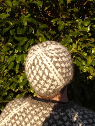 This is a 2-colored beanie worked in the round from the bottom edge and up with a traditional Nordic 2-color allover pattern and rib edge. The pattern is made for at yarn with a yardage with approximate 100 meters per 100 grams. The 2-color stockinette stitch pattern has a gauge of 16 stitches per 10 centimeters. The directions is a combination of text and chart. (Pictured in Hjertegarn Natur uld)