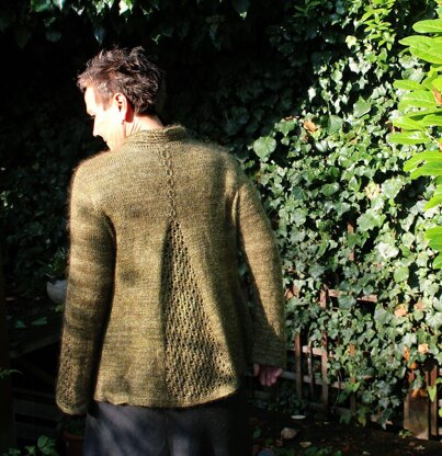 A dreamy & elegant cardigan with a flattering, relaxed drape that hints at curves without clinging. The swingy A-line shape is created by the lace triangle that grows from a small twisted cable down the back.