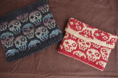 Kranium Kowl is a cowl knit in the round with an allover skull colorwork pattern.