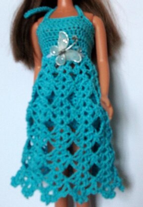This beautiful Sundress is perfect for Barbie to wear when walking along the beach. It has embellishments of a thin ribbon and an ornate butterfly. This Dress comes with a matching FREE hat pattern included!