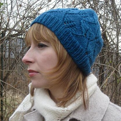 A classic 1 x 1 rib transforms into a beautiful leaf lace pattern for the body of this slightly slouchy hat. The decreases at the top form a seamless star motif.