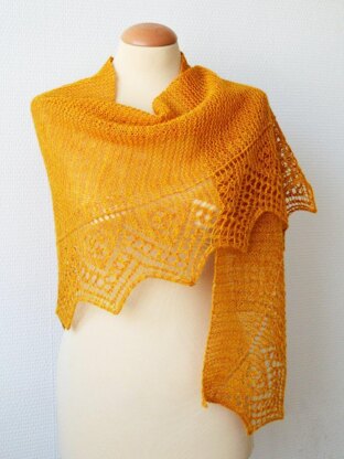Kurkuma is a shallow, triangle scarf, knit sideways. This design features lace patterning in the tradition of the Shetland Isles. The triangle edging is worked at the same time as the body of the shawlette. Worked at a loose gauge, Kurkuma is a lovely and airy layering piece.