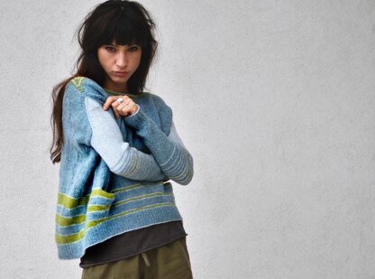 Many interesting details, like the broken up purled sections in between the short row striping, the contrast bind off for a delicate finishing and the playful skinny striping of the sleeves that allow for a fun colour gradation, enhance the overall look of this garment.