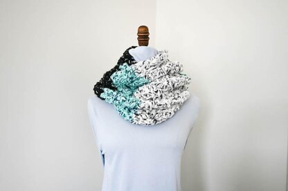 This chunky crochet infinity scarf pattern works up fast with super bulky yarn and a large hook. Color blocking makes a simple stitch combination look interesting.