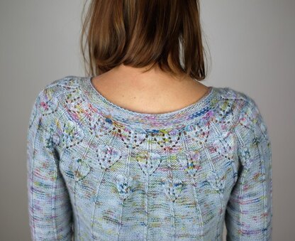 This yoke sweater features a slightly wider scoop neckline and a pretty lace pattern at the neck and shoulders which blends into a reverse stockinette ground with columns of knit stitches. The lace pattern is repeated at the sleeve cuff, and the hems are worked in 1x1 rib.
