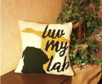 Pattern includes instruction and tips for how to do intarsia crochet, specific instructions for THIS particular pattern and a colored graph. “I Love This Yarn” brand yarn was used for this pattern, however any medium weight (#4) worsted weight yarn with comparable colors can be used. Front of the pillow has the lab art, the back is plain Off White.