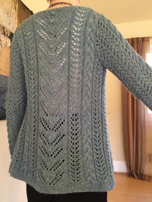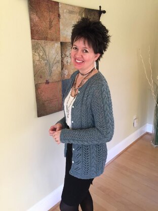 This lightweight, cardigan combines cables and lace specifically designed for airy, cozy alpaca. There are so many time-saving features in this sweater and you’ll find that it knits quickly. The button bands are worked as you go. The pattern is rhythmic and can be memorized. The buttons are easy to align with no measuring. There are no charts. It is worked flat, from the bottom up with no side shaping. Pattern is written out with schematics.