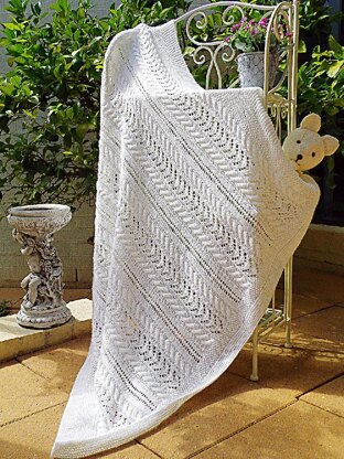 This Baby blanket/ shawl pattern comes with very detailed, easy to read instructions.Would make a beautiful Christening blanket, especially if you thread ribbon through the eyelet holes. Chart included.