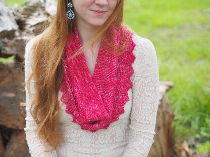 I know how hard it is to decide what to make with that 100 Gram skein of luxury yarn… it’s like trying to pick your favorite dessert at a gourmet patisserie. What better way to show off that lovely yarn than by adorning it around your neck? This is a satisfying knit that will show off your lovely solid, tonal or even crazy-over-the-top-multi. The lace border is worked first and joined into a circle. Stitches are then picked up along the side of the lace border and the body of the cowl is worked in the round.