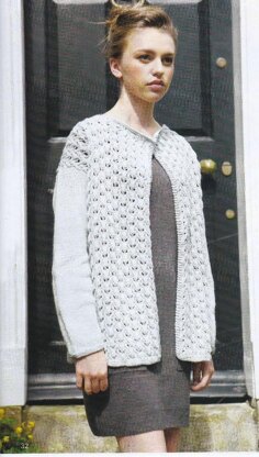 This is a pattern for a Lace and Solid Cardigan, originally published in Knitting magazine called Agnes. I don’t have an issue number. The cardigan has a lace body and solid sleeves. It has no fastenings, and garter stitch edges. The yarn has now been discontinued. Any yarn knitting to the tension can be used. Photos Laurel Guilfoyle for Knitting magazine.