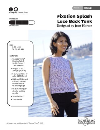 Lace Back Tank in Cascade Yarns Fixation Splash - DK609 - Downloadable PDF is a free Intermediate Knitting pattern by Joan Horton, available as a Downloadable PDF and includes instructions in English. Super fun to make, this pattern could be your next masterpiece!