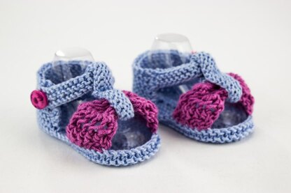 They feature a garter stitch sole, enclosed heel, front and ankle straps that enclose a pretty lace bow.