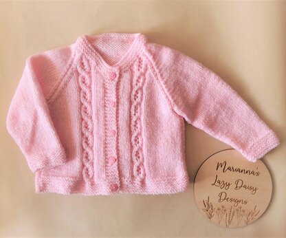 This cute little baby cardigan is knitted in the traditional way - Back, Left Front, Right Front and Sleeves. Then joined together, and the Neckband added.