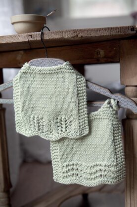 These bibs make a great last-minute gift. Each bib begins with one of two easy-to-knit lace edgings. The remainder of the bib is in stockinette stitch, providing coverage where it's most needed. The straps are knitted with I-cord. You can knit two bibs from one 50 gram ball.