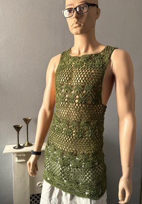 This crochet pattern is for a men's tank top in a lace and mesh finish. The pattern uses diagrams to show you how to make the two contrasting elements and construct a shirt that suits you. There are multiple options for size and shaping, all based on the number of repeats you make.
