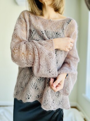 It’s worked with one strand of mohair silk, making it translucent and incredibly soft. The jumper is knitted bottom up in the round up to the sleeves, then back and forth while shaping the neckline and armholes.